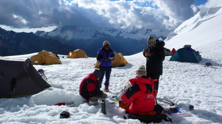 En este lugar nuestros portadores estarán cargándole equipaje técnico de escalada como campamento y estaremos comenzando la caminata hasta el Campo base Chopicalqui (4.350 m .s.n.m).