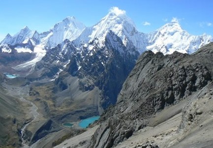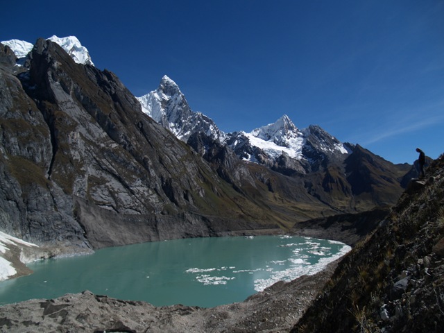 Caminata de 6 – 7 Horas. Se pasa el tercer paso de Carnicero (4600). Descenso por en medio de las Lagunas de Atocshaico, Carnicero. Observamos los nevados Siula, Jural, Carnicero y Trapecio.