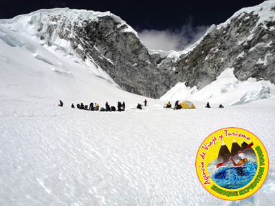 Leaving base camp, we will head up to the left, towards the morrena (5000m). Once entering the glacier, we will find soft snow and pass several hills, until finally reaching a large platform; where we will make camp for the night (Camp 1).
