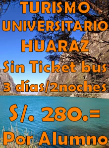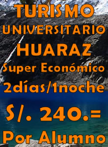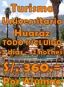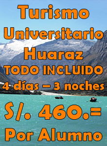 DETALLE : La excursión a la laguna de Llanganuco esta rodeada de exótica vegetación y altas montañas: nevados en cuyo recorrido se aprecia la flora y la fauna típica del Parque Nacional Huascarán, incluye las visitas al pueblo artesanal de Taricá, aeropuerto de Anta, Marcará, Carhuaz, Tinco, Mancos, Ranrahirca, Yungay, Antiguo (Campo Santo), la laguna de Llanganuco a 3,850 m.s.n.m. de altitud, Yungay Nuevo, Caraz donde se visita la campiña y sus restaurantes típicos para saborear los potajes de esta parte del país, retorno a Huaraz. |