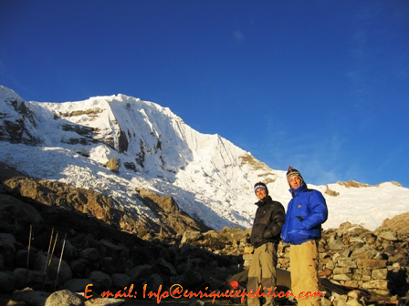 Salimos muy temprano del Cb, subimos una morrena encima de la laguna Lejiacocha y nos dirigimos hacia el C1 (5200) para llegar al C1 hay que pasar una zona pedregosa de unos 400 metros encima de la cual está el C1, en esta parte el equipaje lo llevaremos con porteadores ya que el acceso de mulas es imposible y si hay nieve en esta parte utilizar grampones y piolet en esta zona nos dirigiremos más a la parte izquierda posible y también es conveniente pasar muy temprano ya que caen muchas piedras, por lo tanto le proporcionaremos cascos, la pendiente de hasta 50 -55º. Si es un año seco la nieve empieza a mitad del corredor donde se entra al glacial. Desde este punto al C1 ir Subiendo una interminable cuesta de 40 – 45º porteando nuestras equipaje y también sorteando alguna grietas estaremos llegando al C1 a 5200m estaremos apreciando una vista espectacular del gran plato glacial que tiene este nevado.