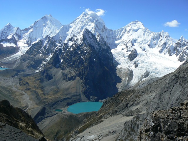 Caminata de 6 – 7 Horas. Se pasa el tercer paso de Carnicero (4600). Descenso por en medio de las Lagunas de Atocshaico, Carnicero. Observamos los nevados Siula, Jural, Carnicero y Trapecio.