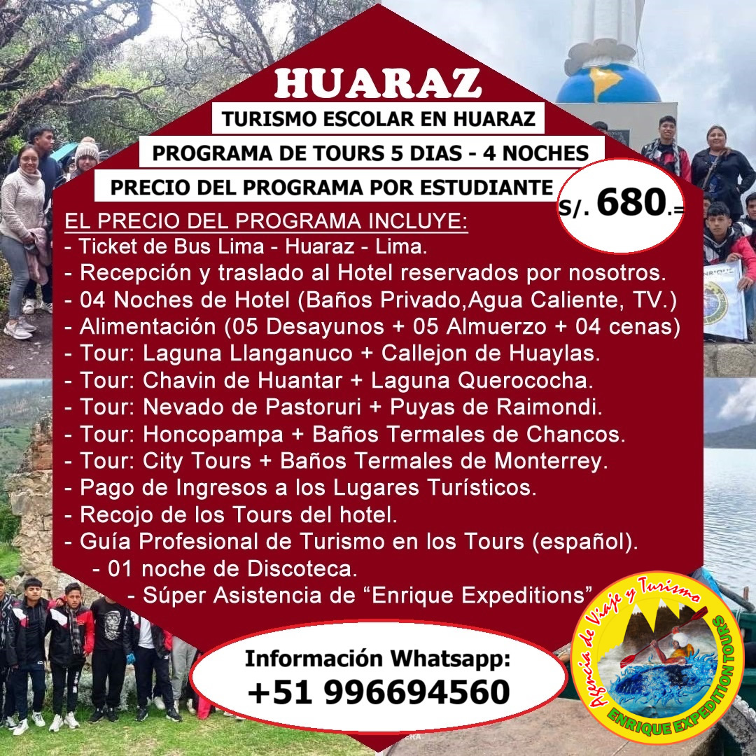 ENRIQUE EXPEDITION TOURS TURISMO ESCOLAR EN HUARAZ, Operadores especializados en la organización en Enrique Expedition Tours Turismo Escolar en Huaraz, contamos con un equipo de profesionales de experiencia laboral en el campo de Turismo Convencional, cuyo objetivo principal es brindar calidad, seguridad y garantía en todos nuestros servicios, de esa manera, cumplir con las expectativas y exigencias del Cliente. Nosotros le ayudaremos a organizar su turismo escolar huaraz precios, turismo escolar huaraz para grupo, turismo escolar huaraz precios económicos, turismo escolar huaraz peru, turismo escolar huaraz para promociones, turismo escolar para huaraz. |