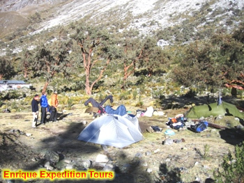 Este día depuse de disgustar de un buen desayuno nos estaremos dirigiremos hacia el campo base, la ruta es por el mismo lugar por donde llegamos a este punto, ya encontrándonos en el campo base estaremos nuevamente cargando nuestro equipaje en los burros para entrar nuevamente a la quebrada de Santa Cruz - laguna Jatuncocha lugar donde situaremos el campamento de este día.
