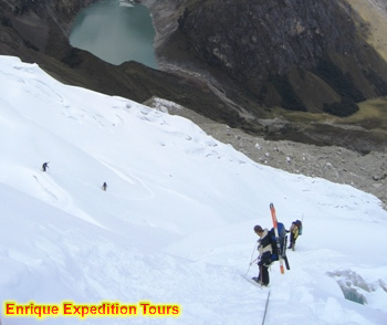 Este día realizaremos la practica de este deporte (Esquí) acompañado del instructor (Guía) este nevado nos permitirá realizar cortos descensos con el Esquí pues el plato glacial de este nevado no es muy grade pero si nos permitirá tomar fotos impresionantes juntos al nevado más bello del mundo ( Alpamayo )- Quitaraju, una vez terminado nuestra actividad estaremos retornando al Campamento.