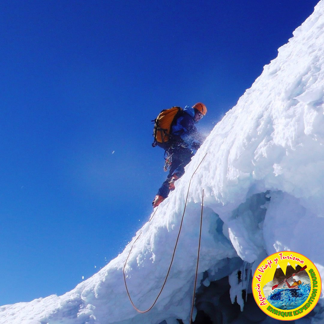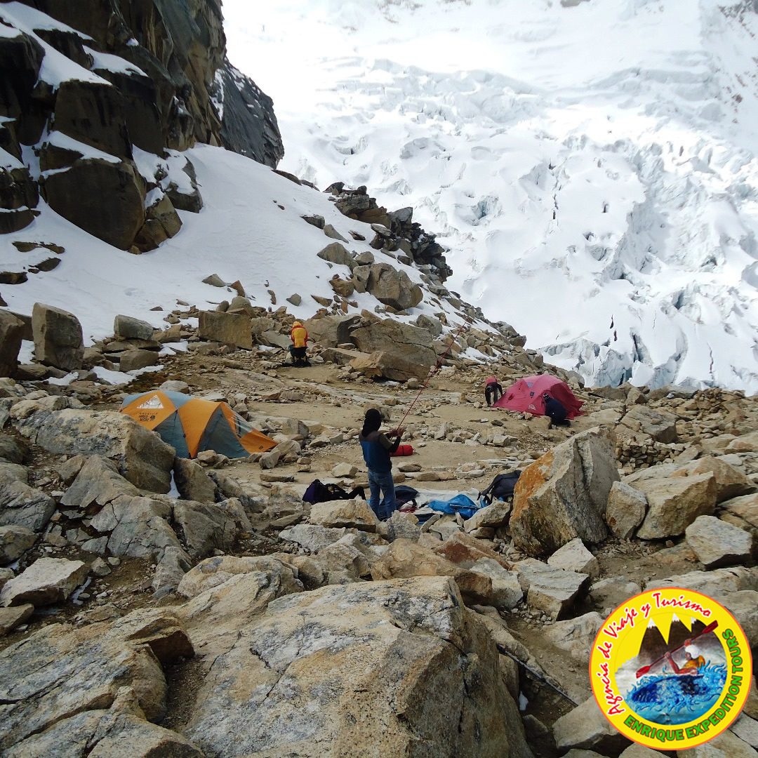 Salimos muy temprano del Cb, subimos una morrena encima de la laguna Lejiacocha y nos dirigimos hacia el C1 (5200) para llegar al C1 hay que pasar una zona pedregosa de unos 400 metros encima de la cual está el C1, en esta parte el equipaje lo llevaremos con porteadores ya que el acceso de mulas es imposible y si hay nieve en esta parte utilizar grampones y piolet en esta zona nos dirigiremos más a la parte izquierda posible y también es conveniente pasar muy temprano ya que caen muchas piedras, por lo tanto le proporcionaremos cascos, la pendiente de hasta 50 -55º. Si es un año seco la nieve empieza a mitad del corredor donde se entra al glacial. Desde este punto al C1 ir Subiendo una interminable cuesta de 40 – 45º porteando nuestras equipaje y también sorteando alguna grietas estaremos llegando al C1 a 5200m estaremos apreciando una vista espectacular del gran plato glacial que tiene este nevado.