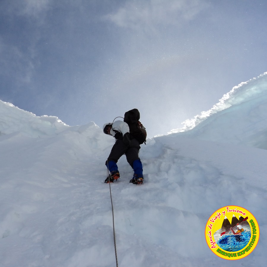 Este día seguimos ascendiendo directamente en dirección al Escudo, que se observar según avancemos como una loma triangular de aproximadamente 450m. Una vez que nos encontremos en el lugar estaremos superándole, escalando algunos tramos en hielo, después de pasar este obstáculo. Estaremos avanzando en travesía ascendente hacia la Garganta, bajo el cual en una zona protegida de avalanchas se instalará el C2 del Huascaran (6000m).