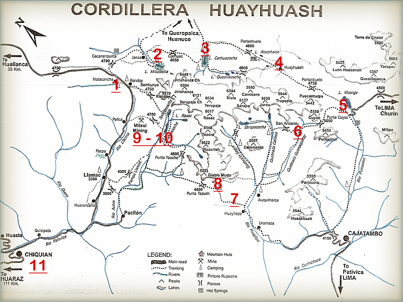 Se pasa el último paso de Pampa de Llamac (4300). Observaremos por última vez parte de los nevados de la Cordillera Huayhuash., para luego dirigirnos a Chiquián (3400) se viajará por el mismo sendero por el cual iniciamos nuestro viaje. Traslado de Chiquián a Huaraz fin de nuestros servicios.