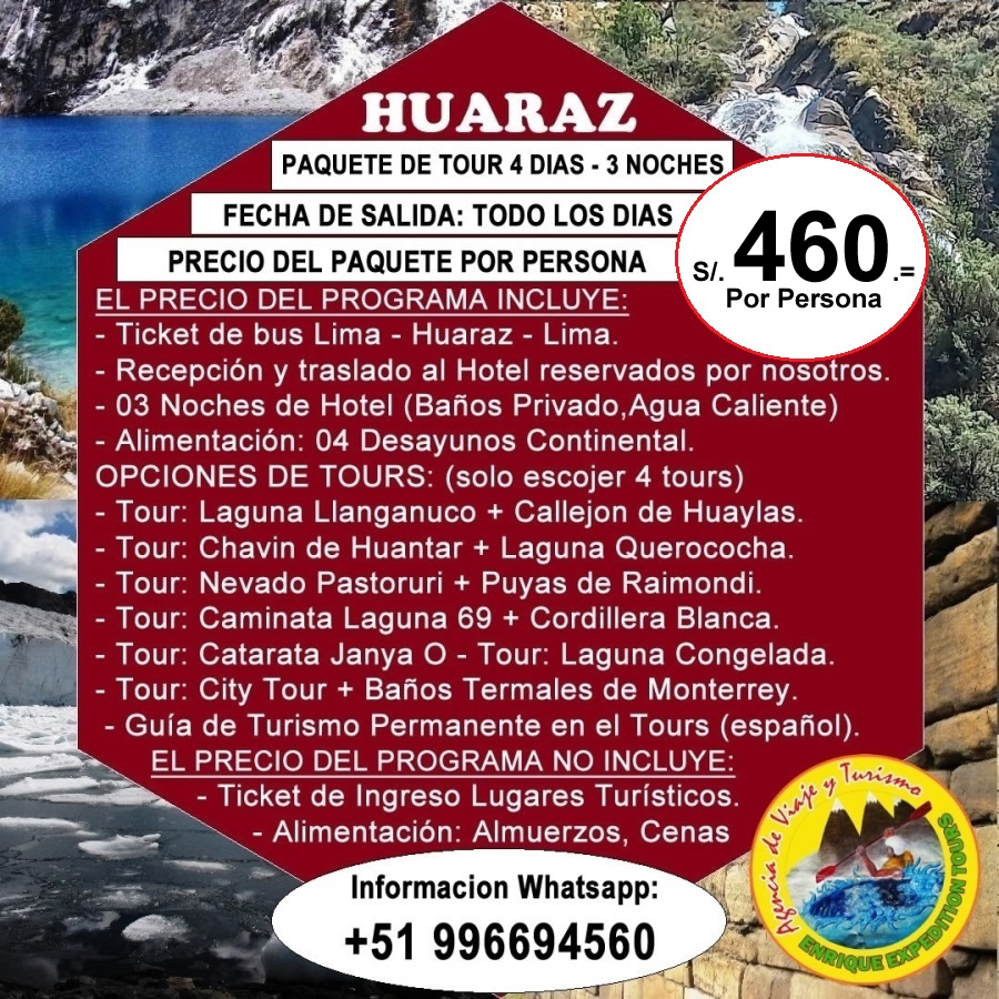 TURISMO ECONOMICO HUARAZ 4 DÍAS – 3 NOCHES. |