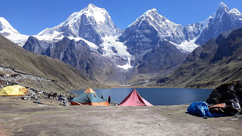 Salimos de campamento y seguiremos la caminata estaremos pasando el segundo paso de Punta Carhuac (4650). Descenso por la quebrada llegada a nuestro campamento en Carhuacocha. Vista panorámica de los nevados Jirishanca, Yerupaja, Toro, etc.