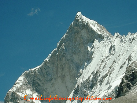 Desde el campo superior en la morrena estaremos alcanzando el borde del glacial, desde donde avanzaremos en ascenso por un lugar mas seguro, en dirección hacia la base de una gran barrera de Seracs. En donde nosotros instalaremos el C1 en el Glacial - jornada de aprox. 6 horas.