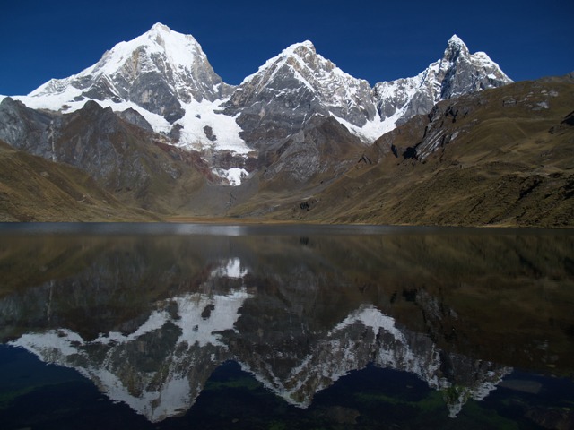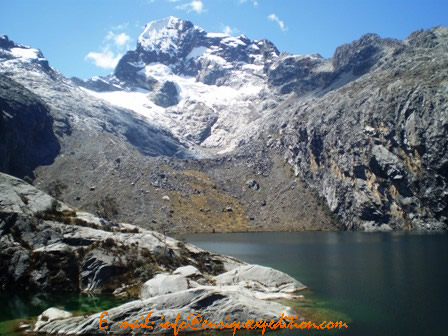 Caminata de 6 – 7 horas. Se pasa el tercer paso de Carnicero (4600). Descenso por en medio de las Lagunas de Atocshaico, Carnicero. Observamos los nevados Siula, Jurau, Carnicero y Trapecio.