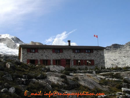 Este día desde el Campo 1 descenderemos con nuestros clientes hasta la base de la pared, posteriormente ascendemos hasta alcanzar la parte mas baja de la rimaya, en esta parte se avanza por una zona en gran pendiente uniforme de unos 55º - 60º y lleguemos a una parte mas pendiente de 85º y de 90º en una altura de 4 metros, continuando por la canaleta original (65º - 75º) encontremos algunos pequeños tramos mixtos hasta llegar a la Cumbre cimera – Col.