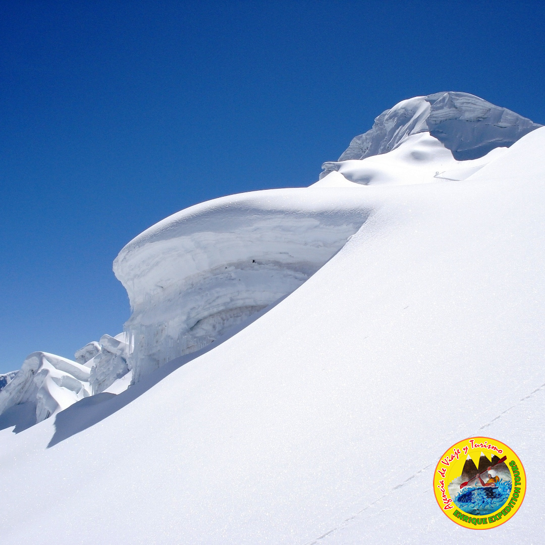 Este día en el trayecto a la cumbre estaremos evitando grietas, hasta el filo de la arista, que es una área plana y fácil, comenzaremos el ascenso a la cumbre, poco antes de la cumbre una grieta interpone. La forma de superar esta grieta es realizando una escalada técnico en hielo en una pared vertical de 90º - 95º, una vez superado este obstáculo estaremos en la cima de Chopicalqui, disfrutaremos de una vista excepcional de la Cordillera Blanca. Retorno al campamento I - Cb.