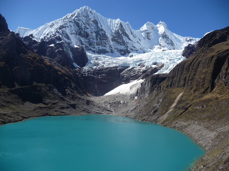 Caminata de 6 – 7 Horas. Se pasa el tercer paso de siula (4800). Descenso por la Laguna de suerococha. Observamos los nevados Siula, Jurau, Carnicero y Trapecio.