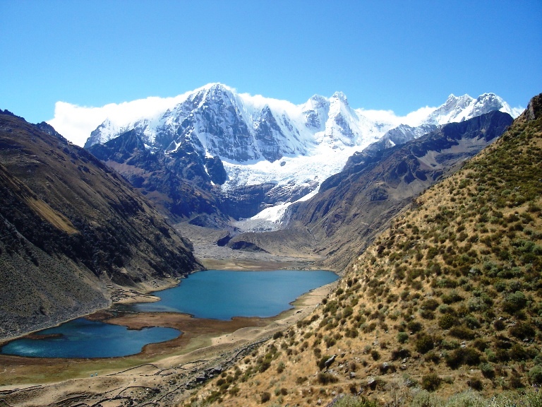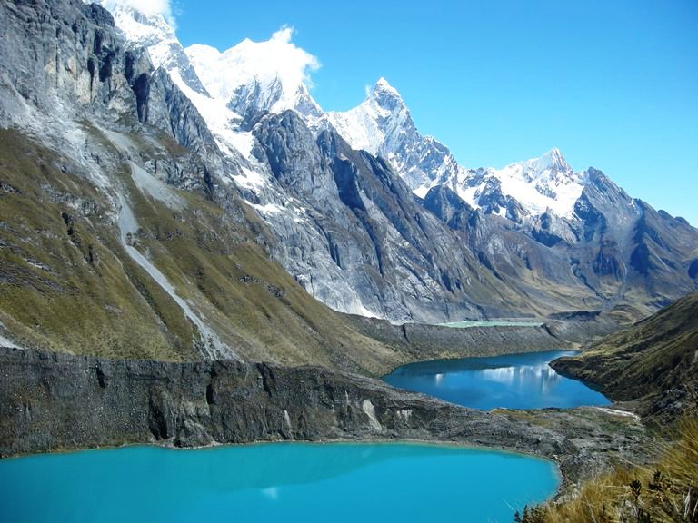 Se pasa el tercer paso de Carnicero (4600). Descenso por en medio de las Lagunas de Atocshaico, Carnicero. Observamos los nevados Siula, Jural, Carnicero y Trapecio.