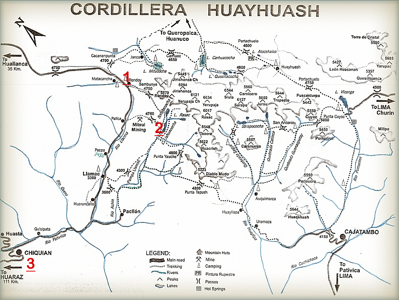 Salida de en de Huaraz a la Ciudad de Chiquián (3400), luego nos dirigimos con destino a Llamac (3250) donde llegaremos a las 9:00 a.m. en este lugar nos espera los burro quienes se encargaran en trasladar nuestros equipaje de campamento como personal y estos son conducido por los arriero, saldemos de Llamac (3250) a Rondoy (3900) Caminata de 6 - 7 horas, se observan los primeros nevados como el Ninashanca. En trayecto pasaremos por los pueblos Pocpa, campamento de la mina Pallca. Llegada al campamento Rondoy (4.000m.)