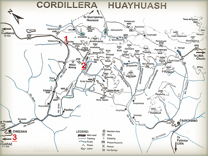 Salida de en de Huaraz a la Ciudad de Chiquián (3400), luego nos dirigimos con destino a Llamac (3250) donde llegaremos a las 9:00 a.m. en este lugar nos espera los burro quienes se encargaran en trasladar nuestros equipaje de campamento como personal y estos son conducido por los arriero, saldemos de Llamac (3250) a Rondoy (3900) Caminata de 6 - 7 horas, se observan los primeros nevados como el Ninashanca. En trayecto pasaremos por los pueblos Pocpa, campamento de la mina Pallca. Llegada al campamento Rondoy (4.000m.)