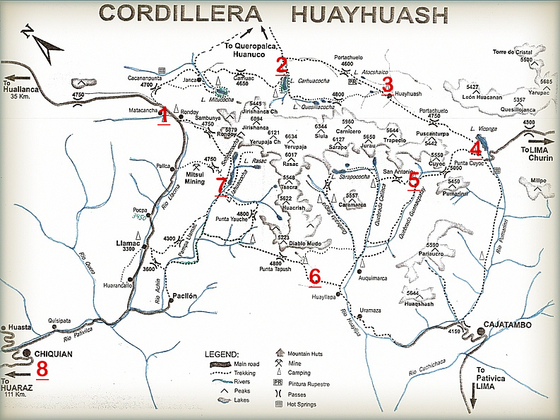 Nuestros arriero estarán cargando nuestros equipajes a las acémilas para dirigirnos hasta llamac, se pasa él último paso de pampa de Llamac (4300). Observaremos por ultima vez parte de los nevados de la Cordillera Huayhuash., después de llegar a Llamac nos estará espera el trasporte de la Compañía “Enrique Expedition Tours” que nos estará trasladando de Llamac – Chaquian – Huaraz – Hotel.